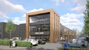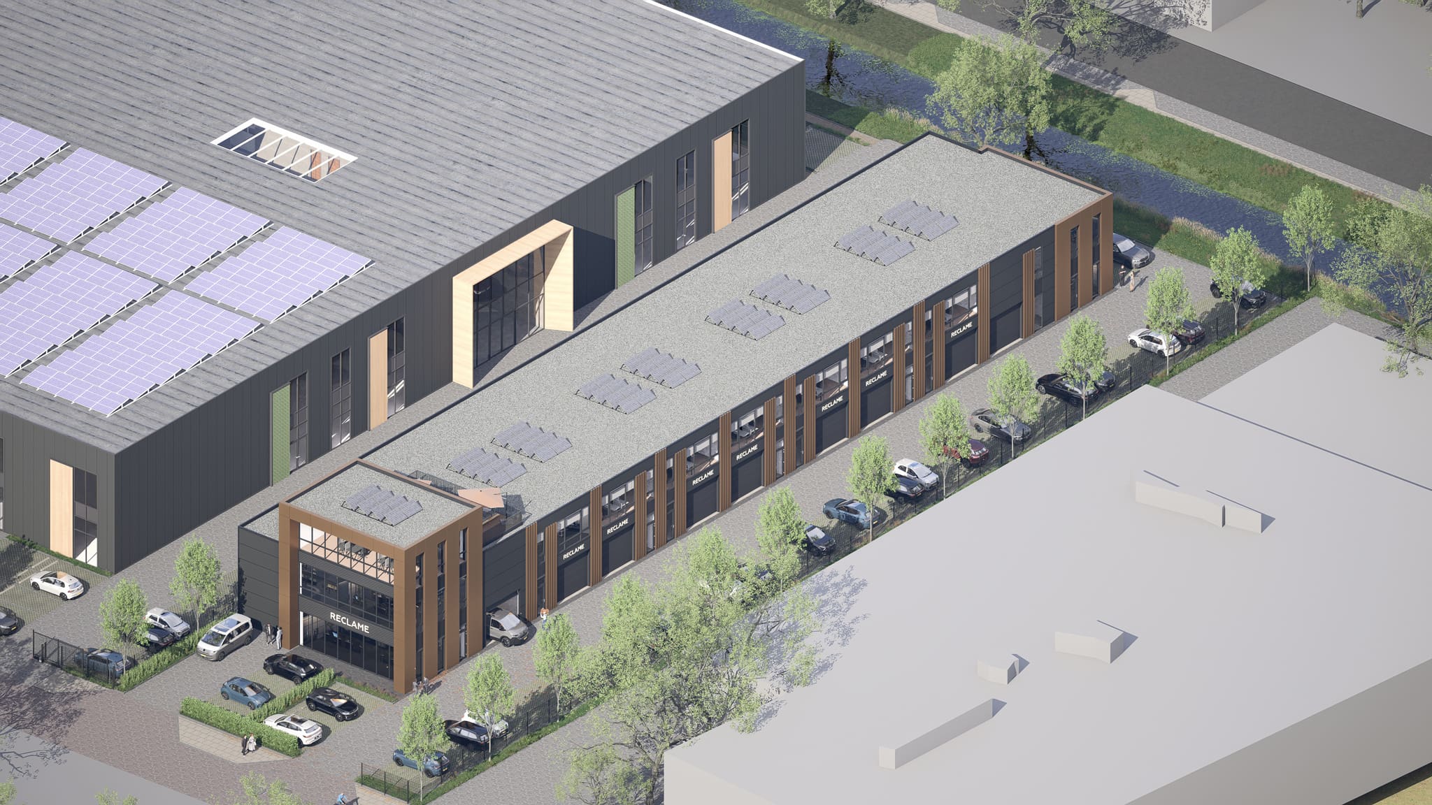 Modern bedrijfsverzamelgebouw met 9 units aan de Cruquiusweg. Van 240 tot 400 m². Parkeren op eigen terrein. Oplevering 2026/2027.